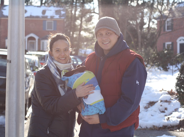 ~ We have taken a few outings in the last week, including lunch out twice, a drive out to the country to look at the horsies, one trip to Target and three doctor's visits. Everybody loves to look at you and the general consensus on your name is that "it's a big name for such a little guy".